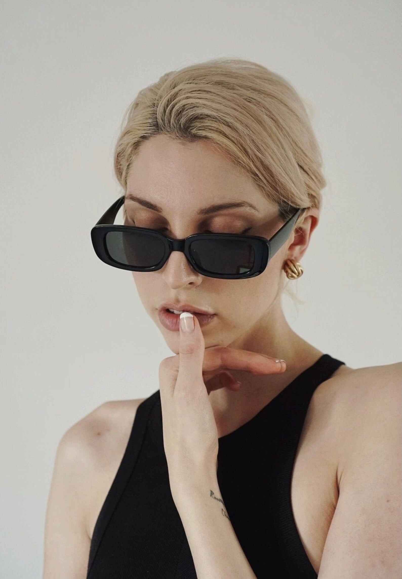 They want to sit on your face. The look: Oversized blazer, high-waisted trousers, and Disclosure. No scrubs allowed, nineties vintage sunglasses and optical frames that truly are all that and a bag of chips.